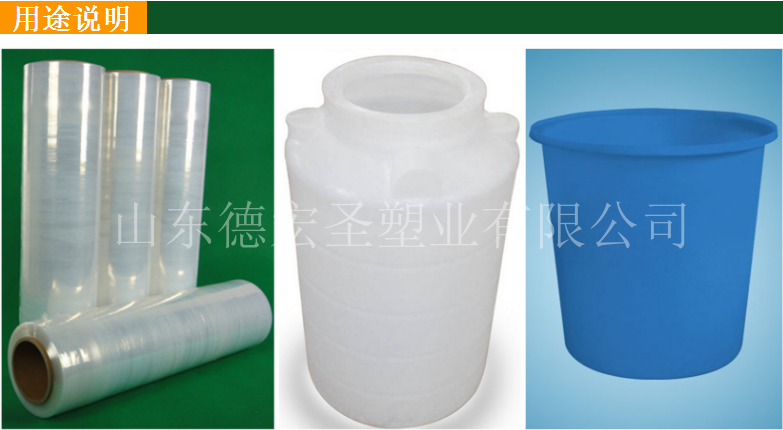 然而,LLDPE与LDPE的共混物将改进强度、抗穿透性和LDPE薄膜的刚度,而不显著影响薄膜的透明度。注塑和滚塑是LLDPE最大的两个模塑应用。这种树脂优越的韧性和低温、冲击强度理论上适于废物箱、玩具和冷藏器具。另外,LLDPE的高抗环境应力开裂性使其适用于注塑与油类食品接触的模塑盖子,滚塑废料容器、燃料箱和化学品槽罐。在管材和电线电缆涂敷层中应用的市场较小,在这里LLDPE提供的高破裂强度和抗环境应力开裂性可满足要求。LLDPE的 65%-70%用于制作薄膜。